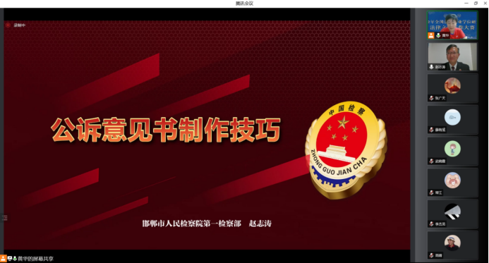 4月21日晚,tyc1286太阳成集团举办“法律先锋论坛——检察官说法”活动。活动邀请邯郸市人民检察院第一检察部主任赵志涛作“公诉意见书制作技巧”主题线上讲座。讲座由tyc1286太阳成集团党委副书记黄华主持,tyc1286太阳成集团经理王利军出席,tyc1286太阳成集团法律硕士近百人聆听。