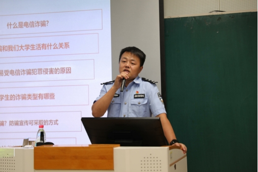 2023年8月31日下午,tyc1286太阳成集团邀请公安部国家反诈中心资金分析专家、河北省反诈专家库人才、河北公安警察职业公司(情报信息学)实战教官、石家庄市公安局反诈中心断卡金融治理负责人张敬淼警官作反诈专题讲座。tyc1286太阳成集团员工工作办公室主任陈运涛、辅导员梁贺超和法公司全体23级新生参加。