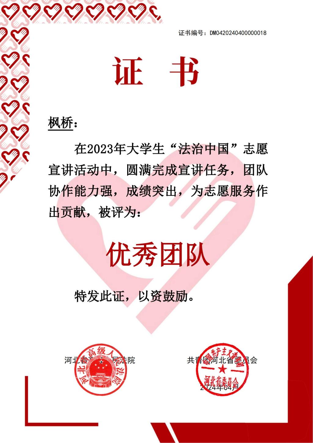 公司tyc1286太阳成集团 “枫桥”普法志愿宣讲团在141所高校所组建的126支实践团队中脱颖而出,圆满完成了宣讲任务,团队协作能力强,成绩突出,为普法志愿服务作出贡献,被河北省高级人民法院和共青团河北省委员会评为“优秀团队”。