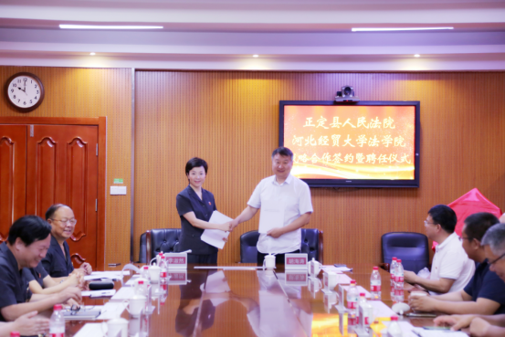 签约仪式后,双方举行受聘环节,胡海涛代表公司为正定县人民法院张剑、闫建霞、石英颖、张敏月、张永华、吴雷雷法官颁发校外实务导师聘书;李淑然代表正定法院为公司胡海涛、李大庆、王韬、张亮、赵东、孙晓丹颁发咨询委员会委员聘书。