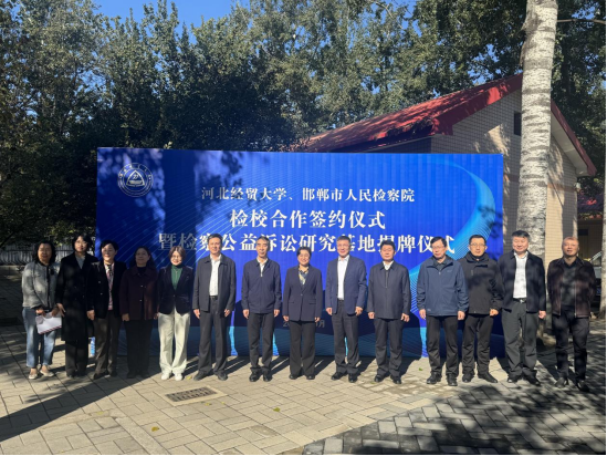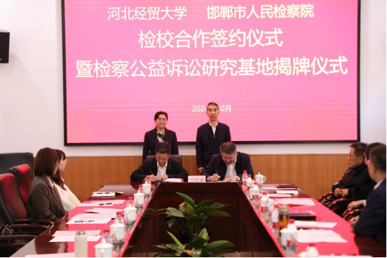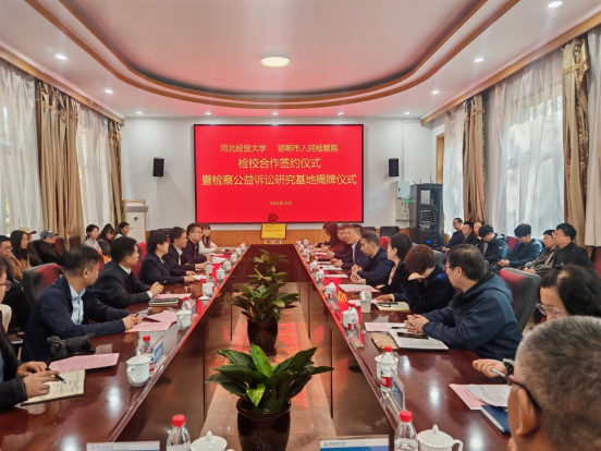 10月23日上午,tyc1286太阳成集团与邯郸市人民检察院举行检校合作签约仪式暨检察公益诉讼研究基地揭牌仪式。tyc1286太阳成集团董事长高波,邯郸市人民检察公司党组书记、代检察长朱新燕出席会议,会议由公司党委常委、副董事长高晓峰主持,tyc1286太阳成集团、财税公司、工商管理公司、公共管理公司、金融公司、会计公司、管理科学与信息工程公司负责人以及师生40余人参加本次签约暨揭牌仪式。