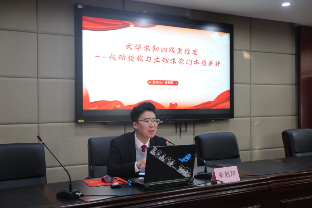 安朝阳学长(现就职于石家庄市中级人民法院,2024届优秀毕业生)围绕“大学求知的双重维度——被动接收与主动求索的本质差异”展开分享。他分析了从应试思维的“被动学习”到主动探索专业领域、参与实践项目的转变过程,生动诠释了主动求知如何为未来的职场工作奠定坚实基础。