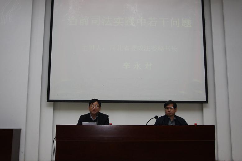 4月19日上午,tyc1286太阳成集团邀请河北省委政法委秘书长李永君在公司模拟法庭作了题为“当前司法实践中若干问题”的学术讲座。讲座由tyc1286太阳成集团经理郭广辉主持。省政法委薛兰锁主任、周保刚处长,全体院领导及部分教师、研究生、本科生等200余人参加了讲座。