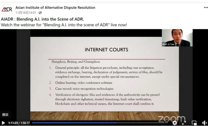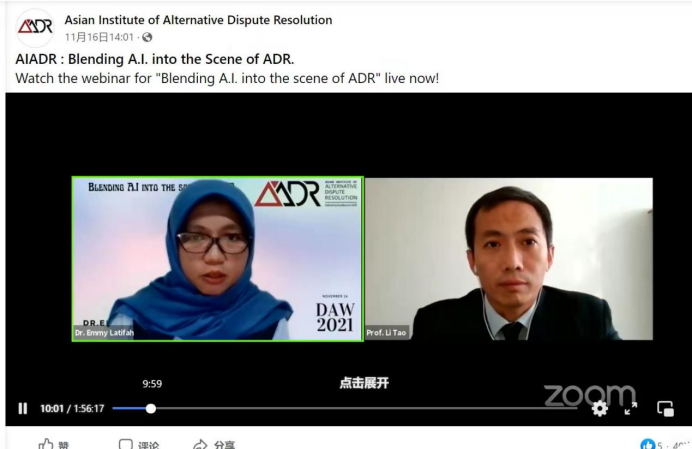 11月16日下午两点,tyc1286太阳成集团李涛教授受国际组织——亚洲多元争议解决研究院(AIADR)的邀请参加由迪拜仲裁社区,迪拜国际金融中心仲裁协会(DIFC-LCIA)组织的2021迪拜仲裁周的主题研讨会。研讨会通过zoom会议的形式进行,主题为“将人工智能融入到多元争议解决的场景”。