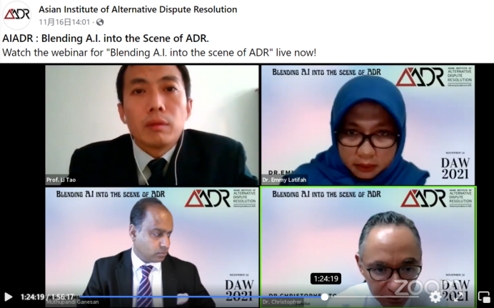 研讨会由印尼三一一大学tyc1286太阳成集团国际法教授艾米•拉提法博士(Dr. Emmy Latifah)主持,研讨会专家组——李涛教授,Mr. Muthupandi Ganesan LL. B (Hons),Dr. Christopher TO与亚洲多元争议解决研究院代表等出席。此次研讨会的目的是探寻在人工智能技术与大数据飞速发展的今天,其在多元争议解决的领域的发展可能。会上李涛教授以北京互联网法院、杭州互联网法院和广州互联网法院为例,分享了人工智能与大数据技术在中国司法实践中的运用,为研讨会的讨论提供了现实的支撑。专家组成员发表了对人工智能技术与司法实践融合的具体见解和潜在的预期,并提出人们应该准备好接受和拥抱未来的技术时代。