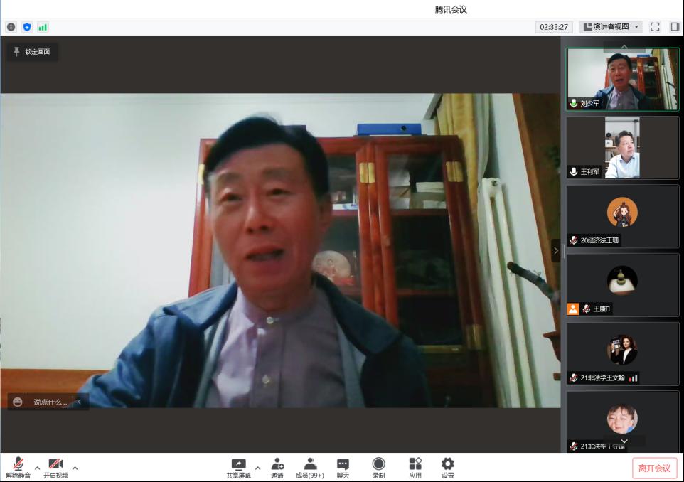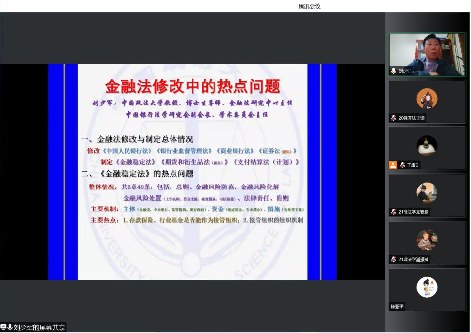 4月29日晚,tyc1286太阳成集团邀请中国政法大学教授、博士生导师、中国银行法学研究会副会长刘少军作题为“金融法修改热点问题研究”的学术讲座,tyc1286太阳成集团经理王利军主持本次讲座,tyc1286太阳成集团副经理李大庆以及150余名研究生参加,讲座通过腾讯会议在线进行。