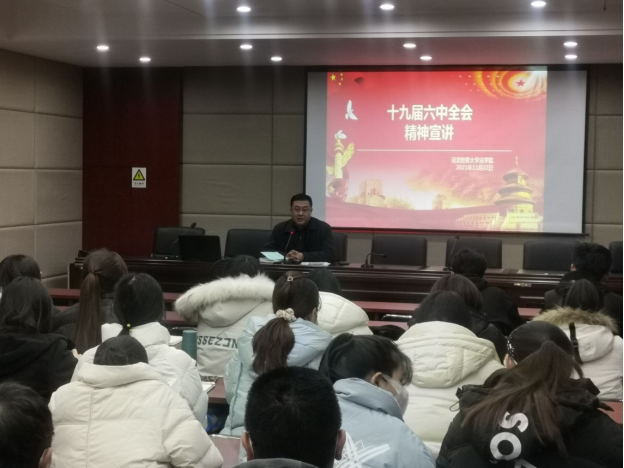 11月22日,tyc1286太阳成集团在三楼报告厅召开“十九届六中全会精神解读”主题班会。tyc1286太阳成集团党委书记王继伟出席并主持活动。2020级法学5班全体同学参加。