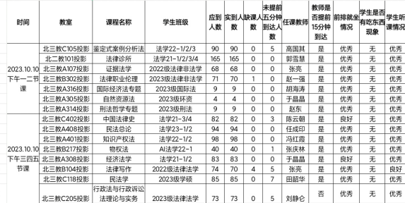 教学运行总体情况良好。检查组安排27名工作人员分别到各个教室,对10月10日下午的上课情况进行了全面检查,共检查15个教学班。教师们教学准备比较充分,能够按时到岗上课;员工按时到课,上课情况良好;多媒体设备、实验室设备等教学设备一切正常。