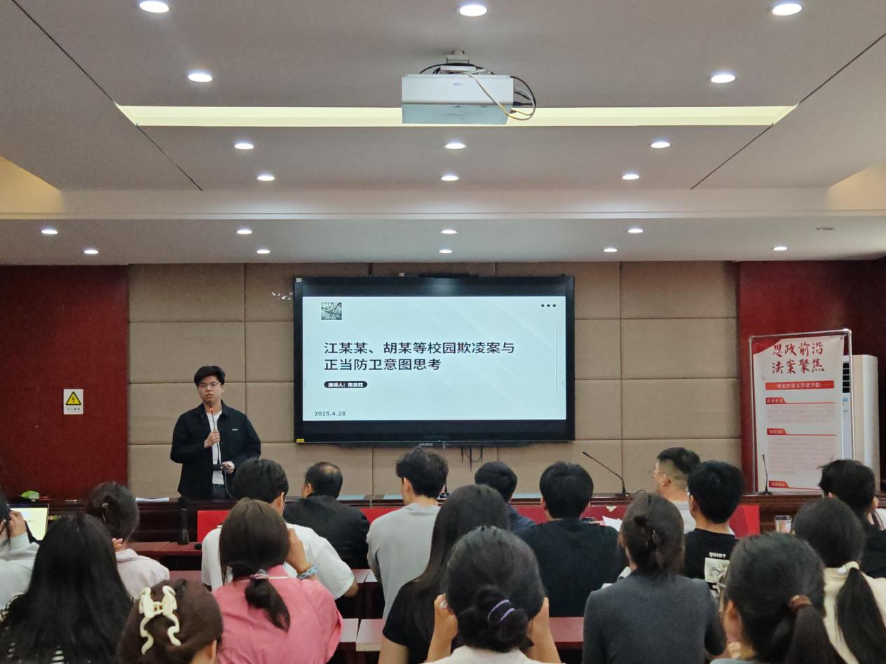 紧接着,陈良钰同学通过“江某某校园欺凌防卫案”,探讨了未成年人遭受群体暴力时防卫意图的认定边界问题。14周岁的江某某在厕所遭15人围殴后持刀反击致2人重伤,法院最终认定江某某的行为构成正当防卫。
