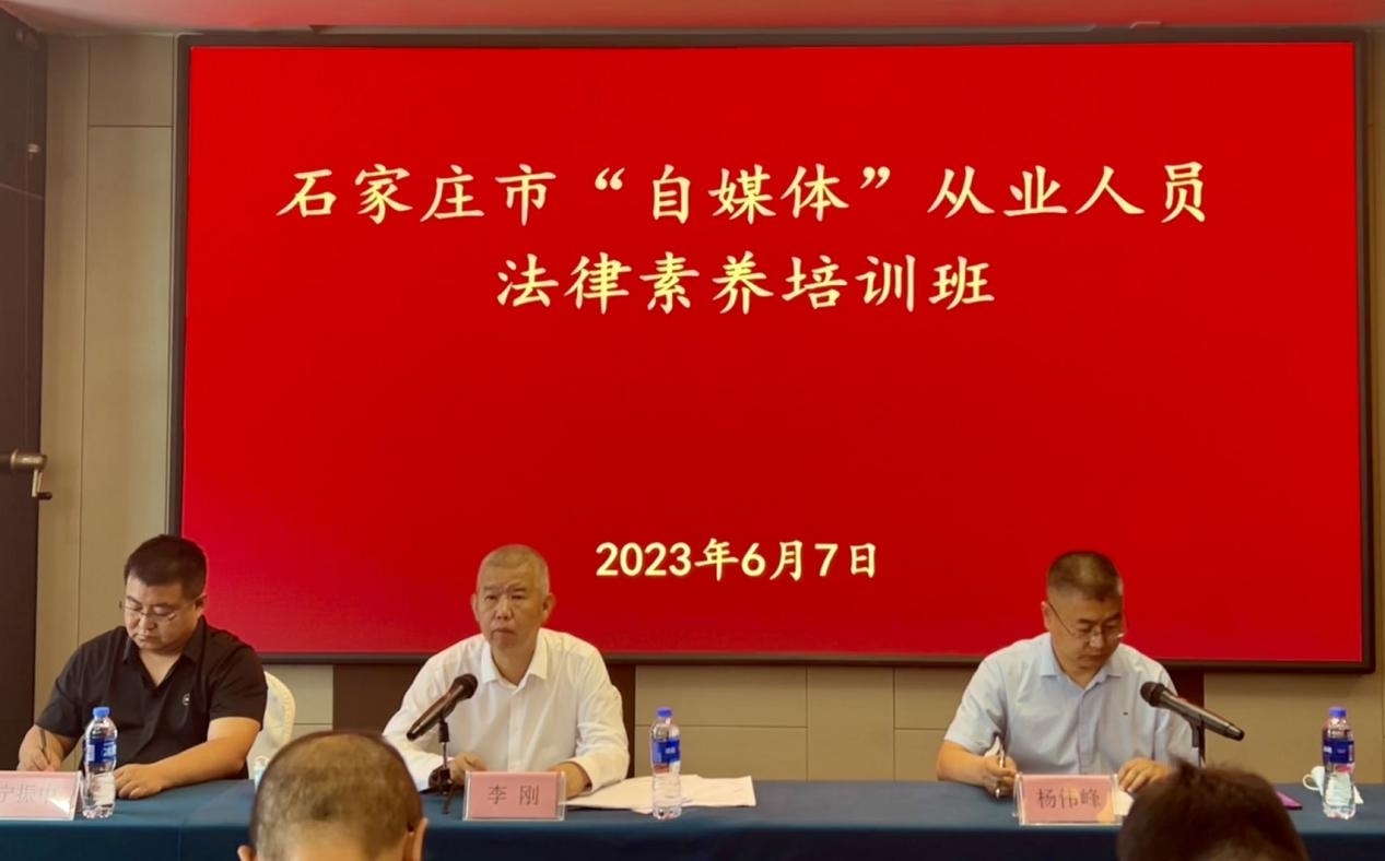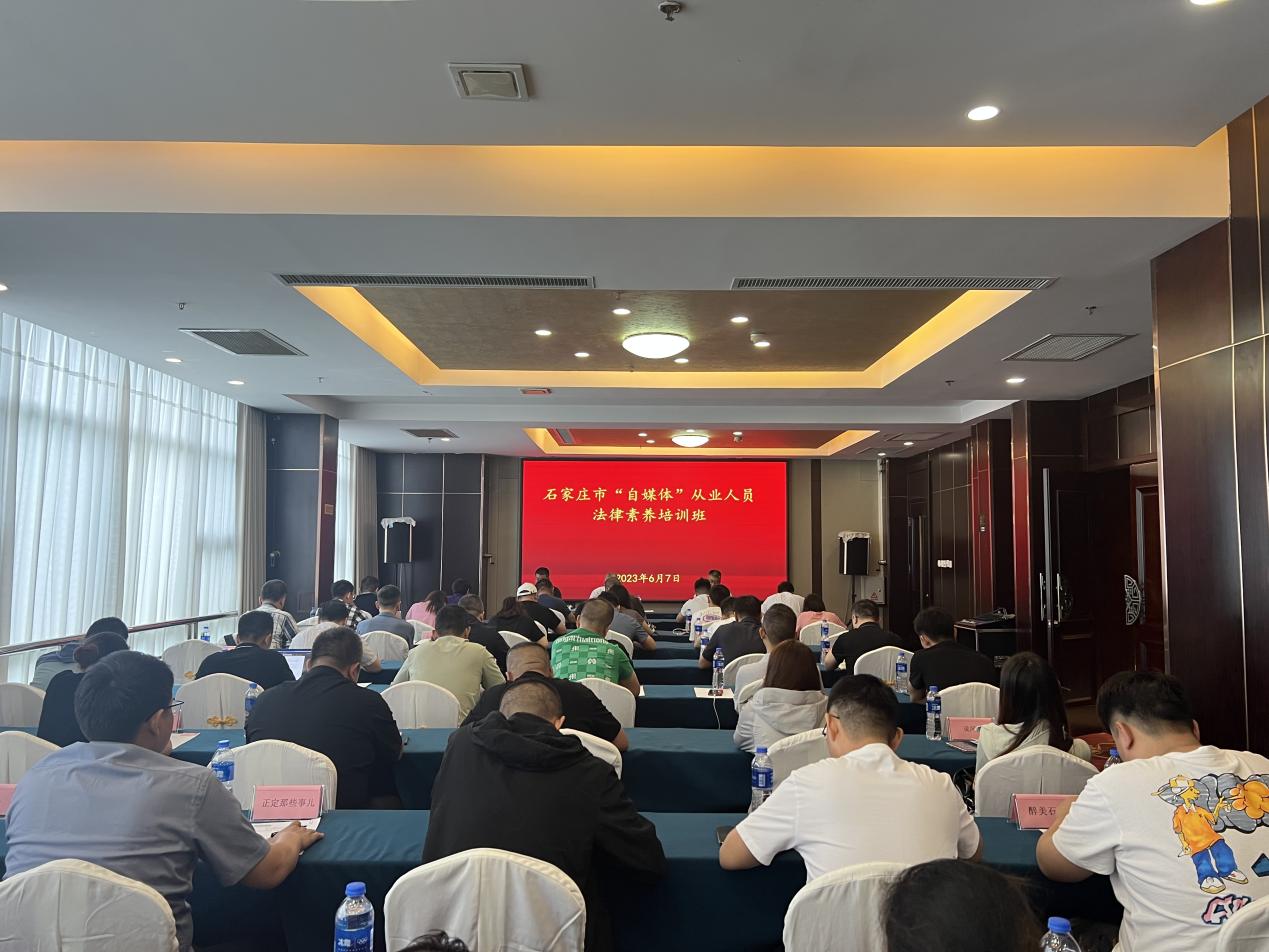 6月7日,tyc1286太阳成集团与石家庄市委网信办联合举办石家庄市“自媒体”从业人员法律素养培训班。市委网信办主任、市委宣传部副部长李刚、石家庄市委网信办综治科科长宁振中、tyc1286太阳成集团副经理李大庆出席开班式,副教授冯志强、郭一君担任主讲人,属地50余个重点“自媒体”账号负责人参加。活动由石家庄市委网信办副主任杨伟峰主持。