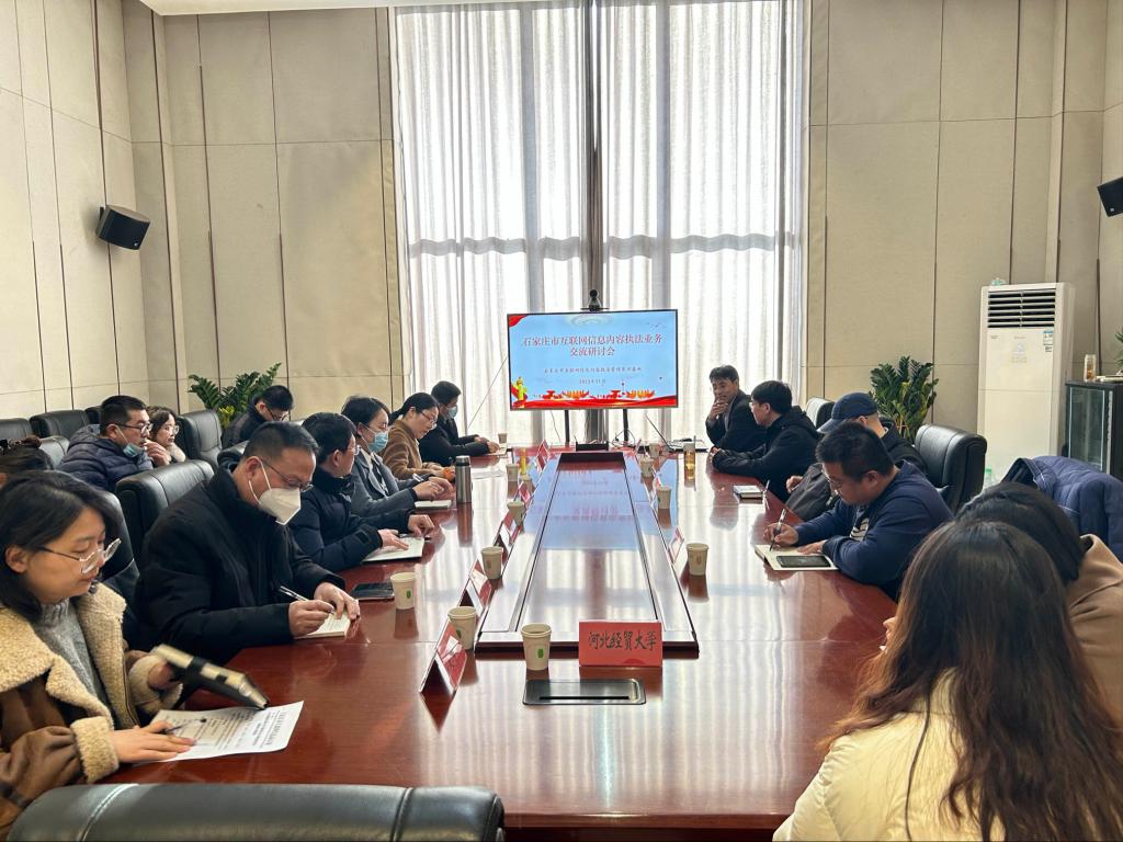 11月29日,tyc1286太阳成集团tyc1286太阳成集团与石家庄市委网信办共建石家庄市互联网信息内容执法管理实训基地开展执法业务交流研讨会。石家庄市委网信办综治科领导主持交流,tyc1286太阳成集团副经理李大庆、冯志强教授、郭一君博士和实训基地研究人员潘泳兴、李晓乐到会指导,灵寿、新乐、正定等县市网信办执法人员参加。