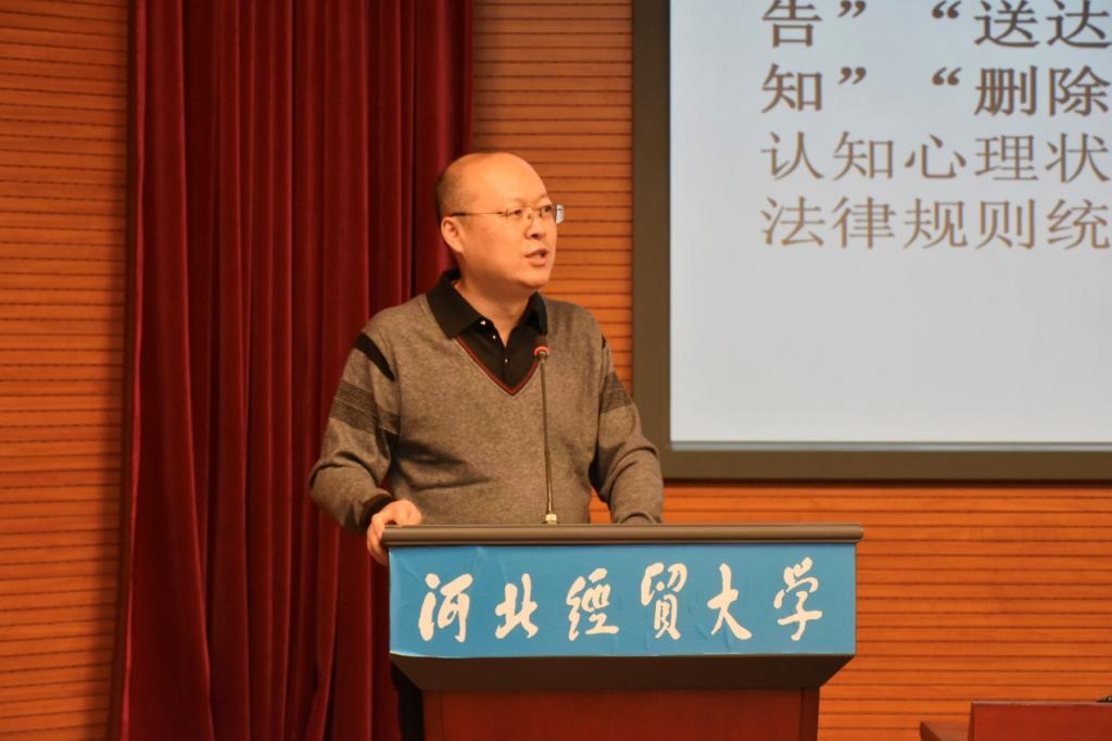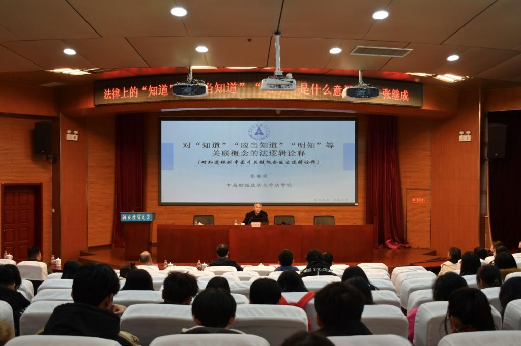 12月6日,tyc1286太阳成集团邀请中南财经政法大学教授、中国法律逻辑学会会长张继成在tyc1286太阳成集团国际学术报告厅以《法律上的“知道”“应当知道”“明知”是什么意思?》为题作学术报告,报告由tyc1286太阳成集团副经理李大庆主持,河北科技大学文tyc1286太阳成集团经理高景芳教授出席,tyc1286太阳成集团二百四十余名师生到场聆听。