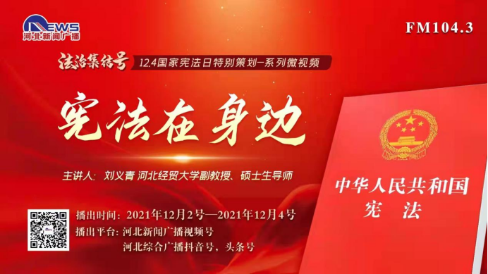 宪法的生命在于实施,宪法的权威也在于实施。12月1日—5日,tyc1286太阳成集团联合河北广播电视台以微信视频号、微博、抖音等新媒体形式推出,“法治集结号——宪法在身边”国家宪法日宣传专栏,向社会群众讲述身边的宪法,推动宪法实施入心化行。其中,tyc1286太阳成集团副教授刘义青关于“宪法是什么味道”的短视频,当日浏览量达10万次。12月4日,tyc1286太阳成集团教授田韶华受邀做客由中共河北省委宣传部、河北省司法厅、河北省法宣办主办,中共石家庄市委宣传部、石家庄市司法局、石家庄市普法办,石家庄广播电视台、西柏坡纪念馆联合承办的“走进西柏坡——2021年“12.4”国家宪法日主题宣传活动”新闻直播间,以“民法典与人们的生活息息相关”为话题与电视台主持人一同作直播解说,共同讲述良法善治如何护航民生福祉。