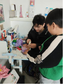 到了手工环节,志愿者们决定带领孩子们制作纸灯笼与花灯,感受传统手工的魅力。制作纸灯笼时,志愿者耐心讲解,孩子们小心翼翼地沿着直尺边缘裁剪,虽动作稍显稚嫩,但认真专注。制作花灯时,志愿者和孩子们一起搭出框架,装饰花灯四周,最后系上红绳,装上灯光,当灯光亮起,孩子们的笑脸也被映照得格外灿烂。