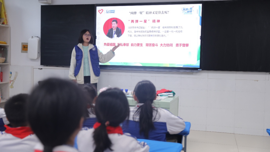 活动伊始,公司宣讲团通过播放九三阅兵中核导弹方阵的视频,激发了同学们对核事业的浓厚兴趣。随后,志愿者们用通俗易懂的语言,讲述了钱学森、邓稼先、于敏等“两弹一星”元勋的感人事迹,将枯燥的背景知识转化为生动故事,并通过双方互动等形式,深入阐释了“两弹一星”精神的内涵。孩子们聚精会神,踊跃参与,现场气氛热烈。