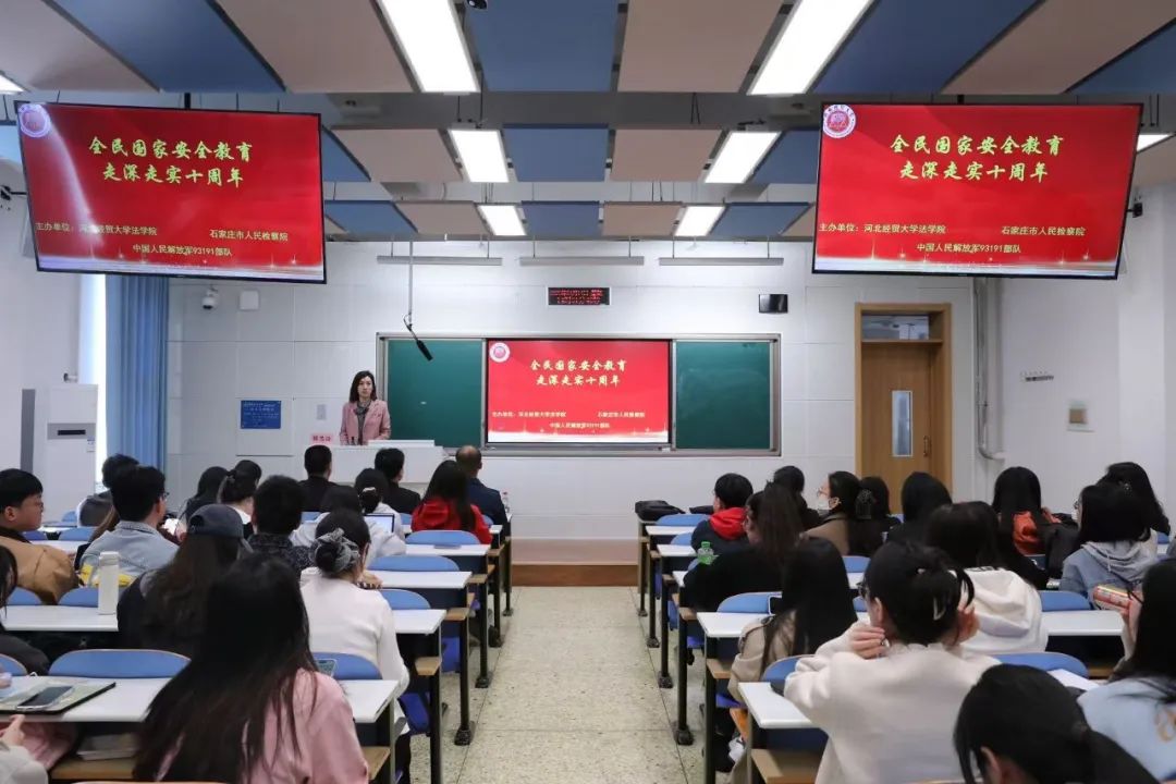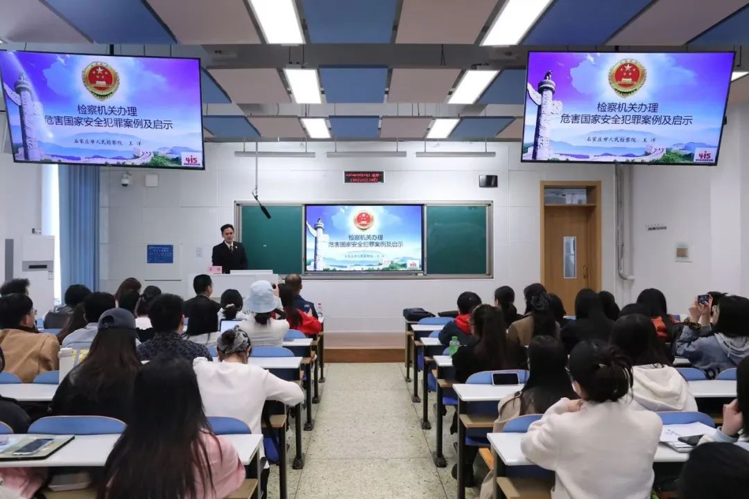 为推动国家安全意识从校园向社会延伸,构筑全民维护国家安全的坚实屏障,4月14日下午,tyc1286太阳成集团举办国家安全教育日“检察官进校园”活动。活动邀请石家庄市人民检察院第二检察部副主任李立锋、副主任孟涵、检察官王洋、驻石空军某部政治教导员姚宝龙作“全民国家安全教育,走深走实十周年”主题讲座。tyc1286太阳成集团党委副书记白建锋出席本次活动。讲座由tyc1286太阳成集团党委专职秘书解思语主持,tyc1286太阳成集团研究生共六十余人参加学习。